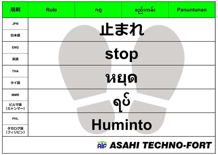 私達の工場では絶対守って欲しいルールを目で見てわかるように多国語ポスターを作っているんだって。ちょっと1例を紹介します。